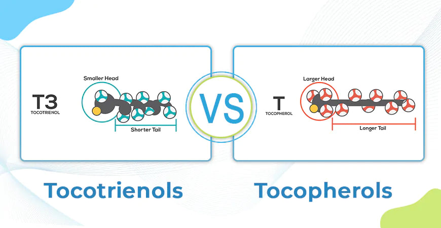 --> Tocotrienols are made up of a shorter molecular structure and therefore are light in weight and have increased mobility; they cover larger cellular surface areas and are able to penetrate into a vast number of cells due to their smaller size, making them almost 50x times more effective than Tocopherols.